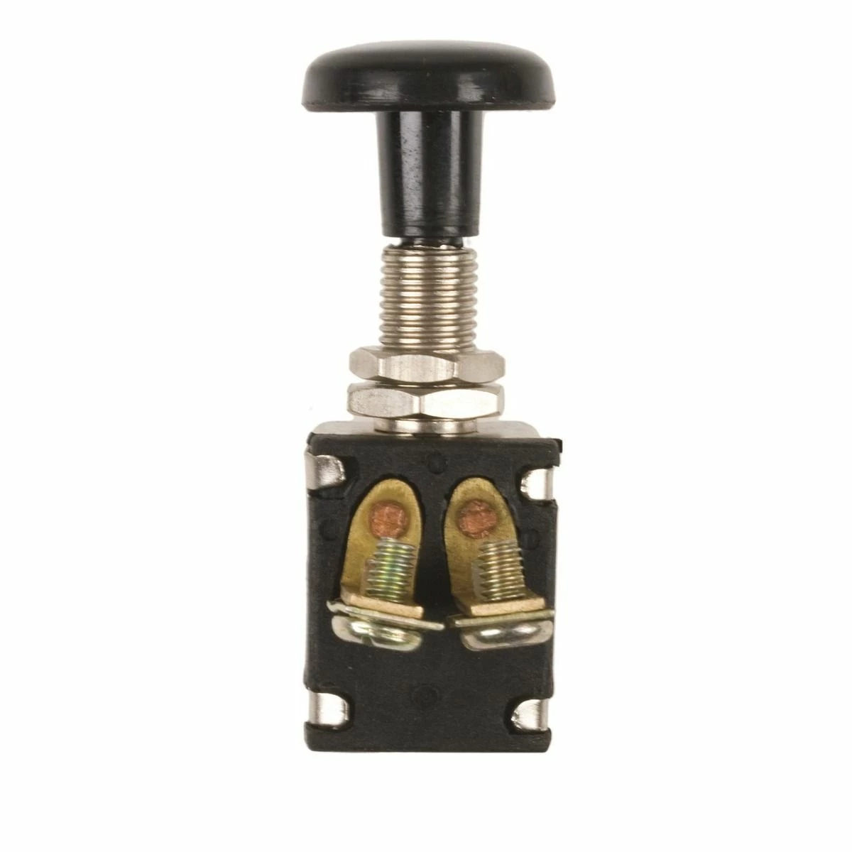 - Two (2) position off-on (normally off) one circuit, screw terminal, for 6 to 36V (DC) electrical systems, plated steel case with plated steel or aluminum mounting stem (3/8″-32 thread, 5/8″ long)